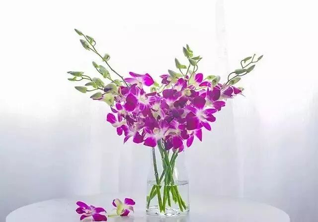 3、三分之一水位,开始插瓶,收到的洋兰会有长有短参差不齐,可将短一些的插中间,长一点的插在两侧,显得规整大方.